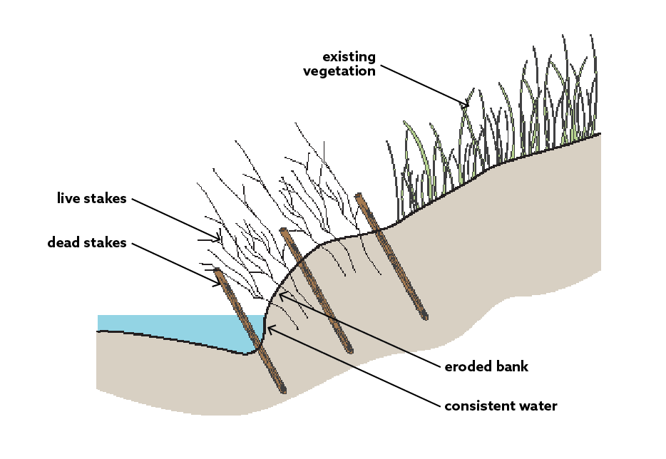 Optional: use dead stakes to protect live stakes or secure large stones. Dead stakes should be straight and free of branches. Ligustrum is recommended.
