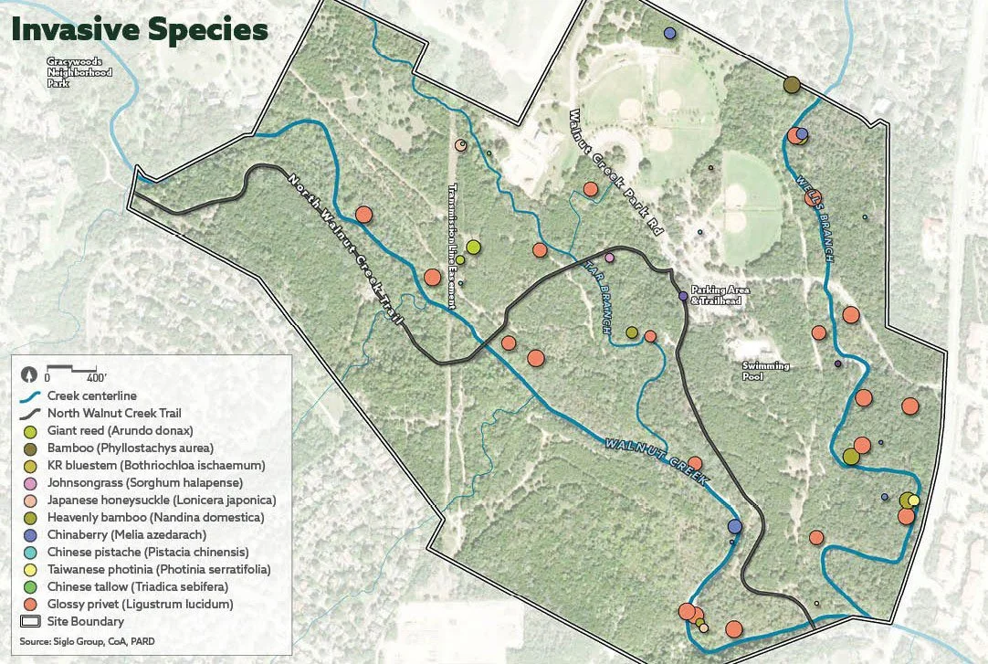 Use species ID tools like iNaturalist to confirm the presence of Glossy Privet, Chinaberry, Nandina, and other invasives listed in the Zilker Park Natural Resource Inventory (pp. 8–10).