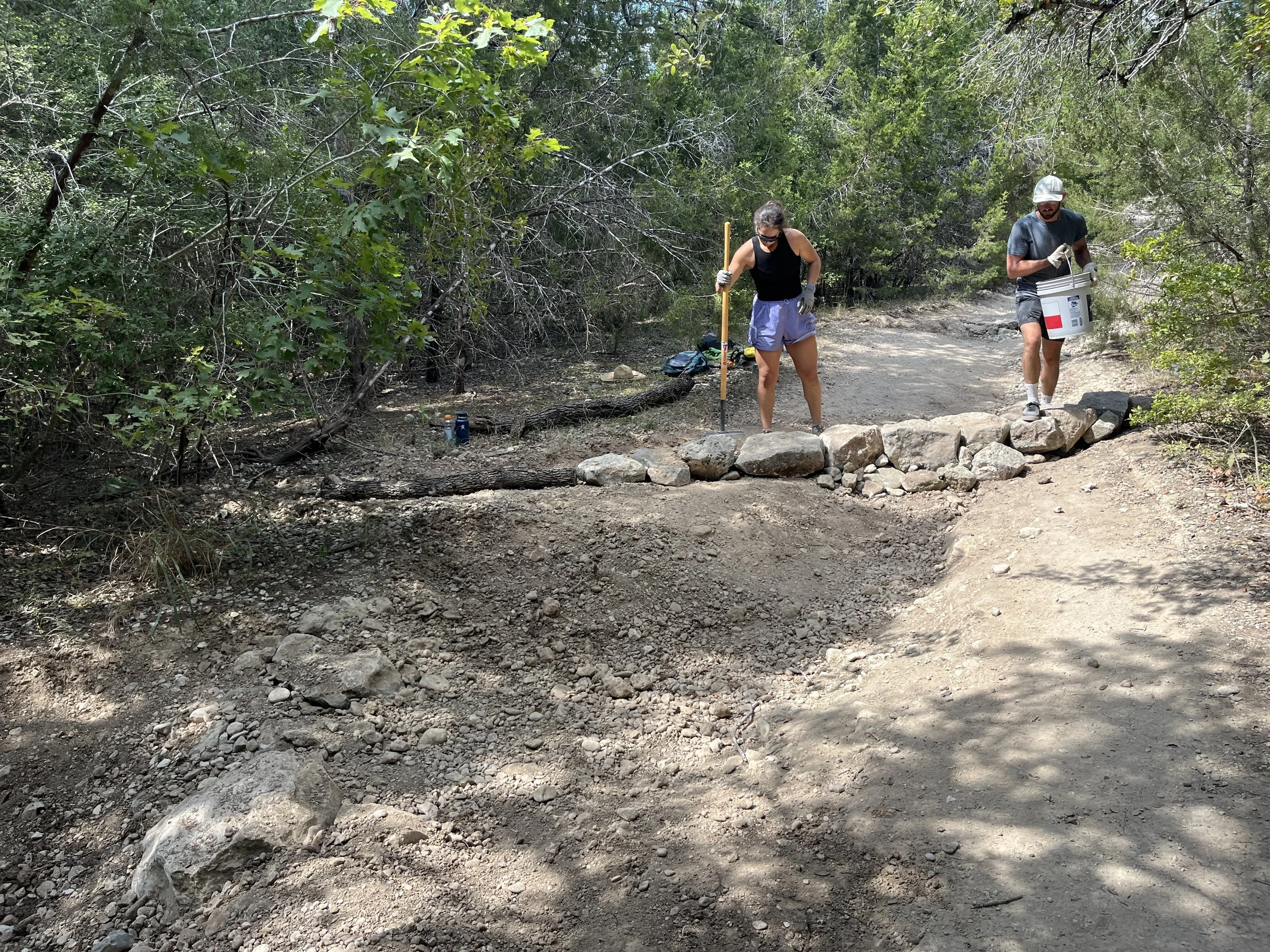 Volunteers play an essential role in mitigating erosion by implementing drainage solutions such as water bars and rolling grade dips. A water bar is a physical structure placed at an angle across the trail to redirect water off its surface. Materials like logs or rocks create a barrier, ensuring water flows away from the tread. Rolling grade dips, on the other hand, are depressions built into the trail to guide water off naturally. Both solutions help prevent water from flowing down the trail, reducing erosion while maintaining accessibility for users.